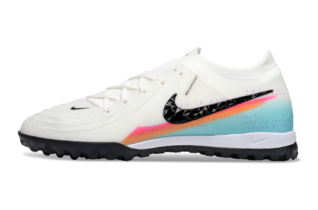 Textura Generativa na Sola/Padrão de Tração: A sola possui uma textura projetada para oferecer tração confiável e agilidade. Embora algumas versões Elite de Campo usem o padrão Nike Cyclone 360 (para cortes rápidos e redução da tração rotacional), as solas de society (TF) são adaptadas para o piso mais duro e raso do sintético, focando na aderência multidirecional.